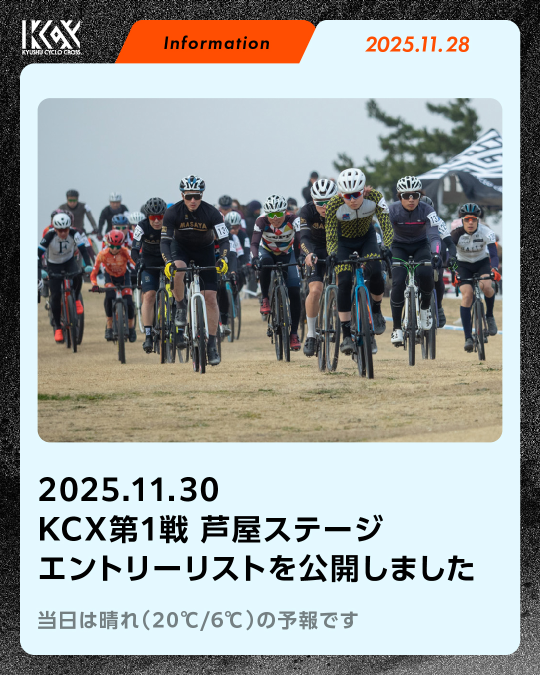 第1戦 芦屋ステージ エントリーリスト公開 お知らせ 2025.11.28 いよいよ2日後に迫った芦屋ステージ。エントリーリストを公開しました。選手の皆様は公式サイトの芦屋ステージページをご確認ください。 芦屋ステージ エントリーリスト(PDF) 九州以外からの強豪選手の名前もあり、これまでにないレース展開も予想されます。日中は気温も高くなる予報なので、ぜひ応援にもお越しください! Photo: Atsushi Tanno